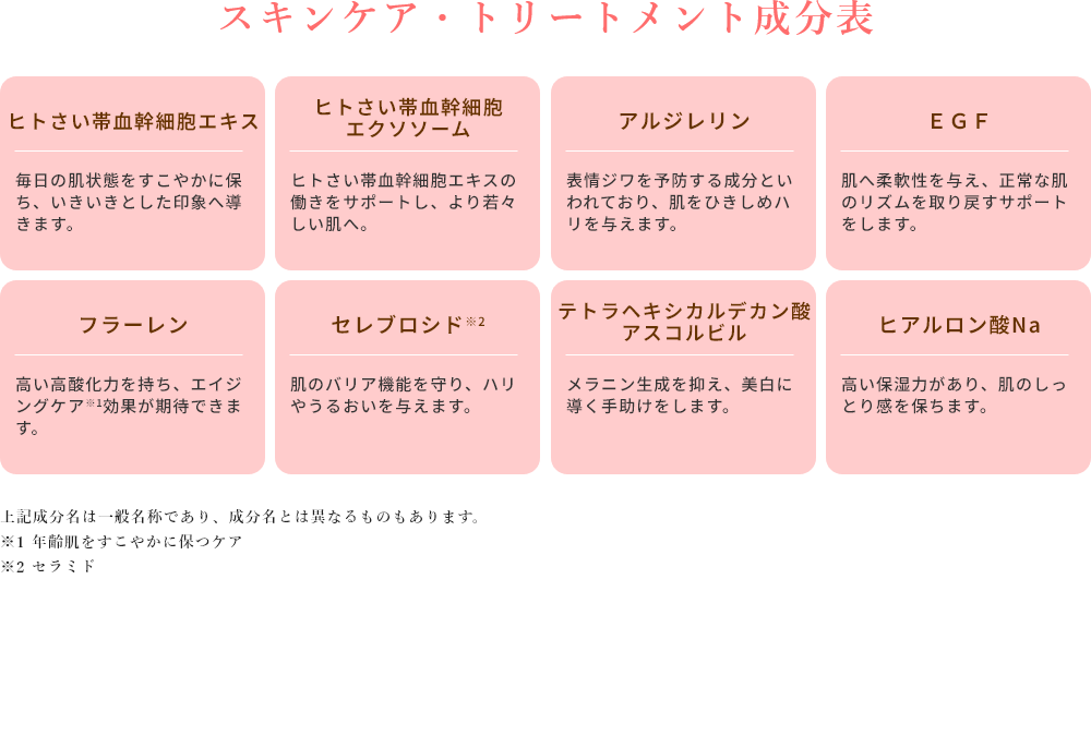 成分:水、シクロペンタシロキサン、シクロヘキサシロキサン、シクロメチコン、ステアリン酸グリセリル(SE)、BG、グリセリン、ジメチコン、ベヘニルアルコール、ヒトサイタイ血由来幹細胞エクソソーム、ヒト臍帯血細胞順化培養液、アセチルヘキサペプチド-8、合成ヒト遺伝子組換オリゴペプチド-1、フラーレン、テトラヘキシルデカン酸アスコルビル、ヒアルロン酸Na、ローマカミツレ花エキス、トウキンセンカ花エキス、ヤグルマギク花エキス、カミツレ花エキス、セイヨウオトギリソウ花/葉/茎エキス、セレブロシド、フユボダイジュ花エキス、セスキオレイン酸ソルビタン、ステアレス-8、ポリソルベート60、PEG/PPG-19/19ジメチコン、トリメチルシロキシケイ酸、セチルPEG/PPG-10/1ジメチコン、イソステアリン酸ソルビタン、(ジメチコン/ビニルジメチコン)クロスポリマー、1,2-ヘキサンジオール、レシチン、水添レシチン、コレステロール、リン酸Na、ペンチレングリコール、カプリリルグリコール、PVP、フェノキシエタノール、トコフェロール、(+/-)酸化チタン、水酸化Al、タルク、カオリン、酸化鉄