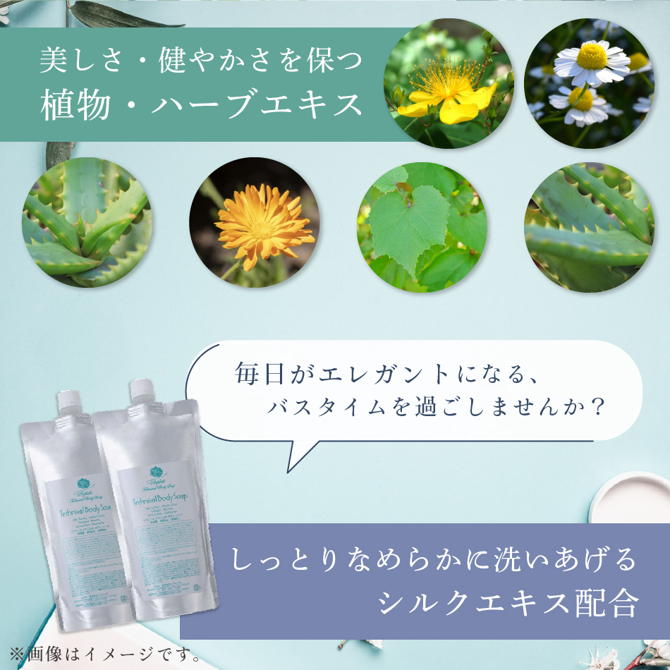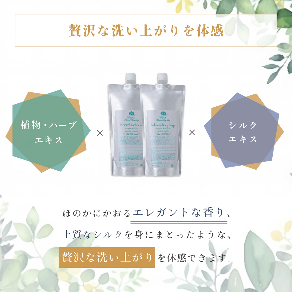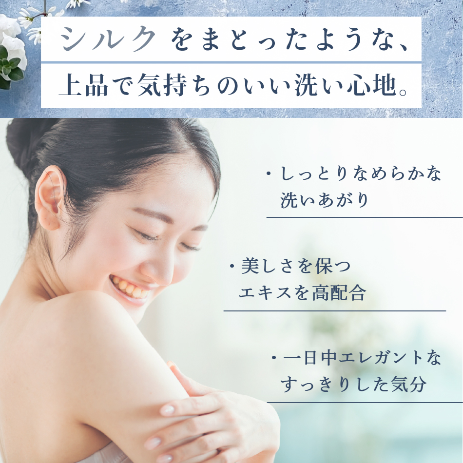 シルクエキスも配合しているので、乾燥しやすい「ひじ・ひざ・かかと」なども潤い柔らかに。一日中エレガントな気分にさせてくれる、上質なシルクを身にまとったような、贅沢な洗い上がりを体感できます。