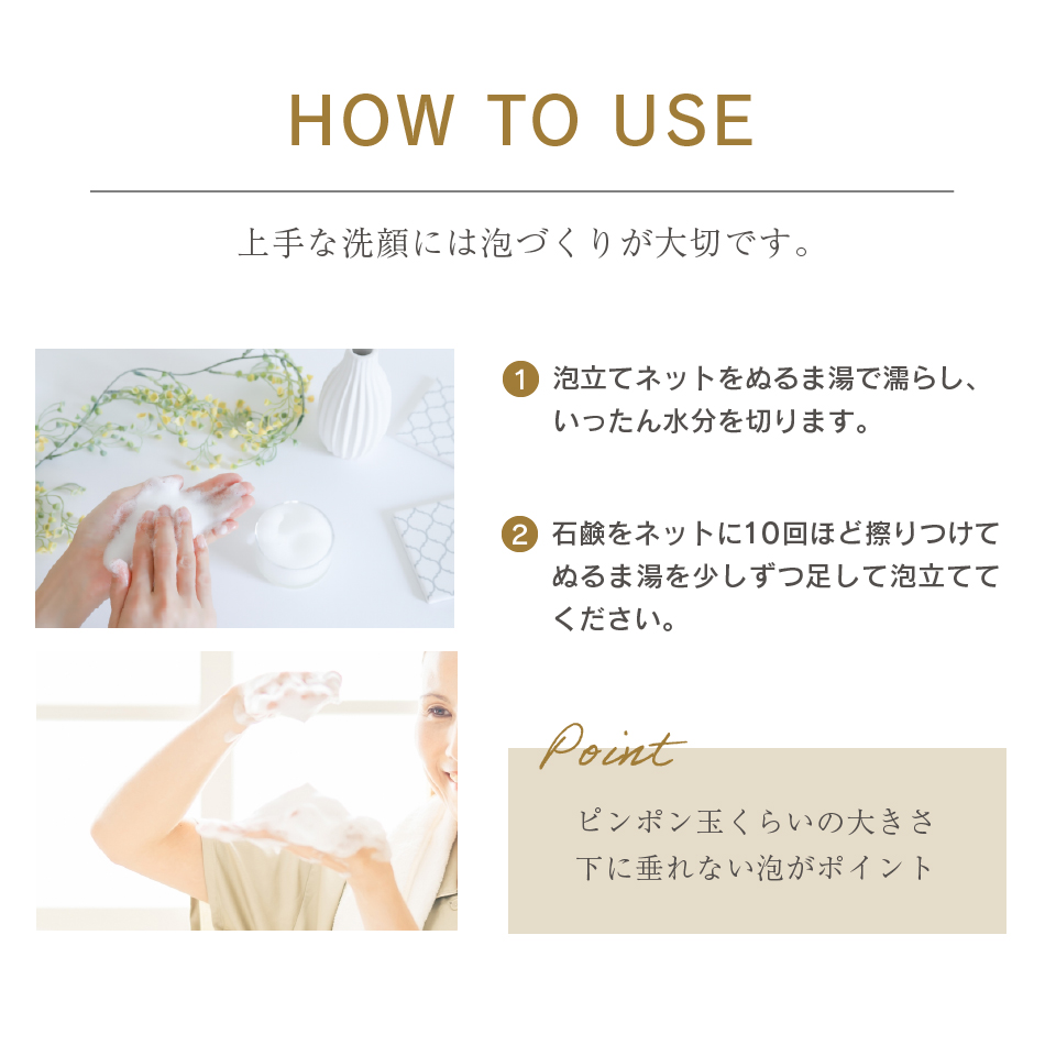 2度目の洗顔で、毛穴に詰まった汚れ、老化した古い角質をきれいに洗い流します。