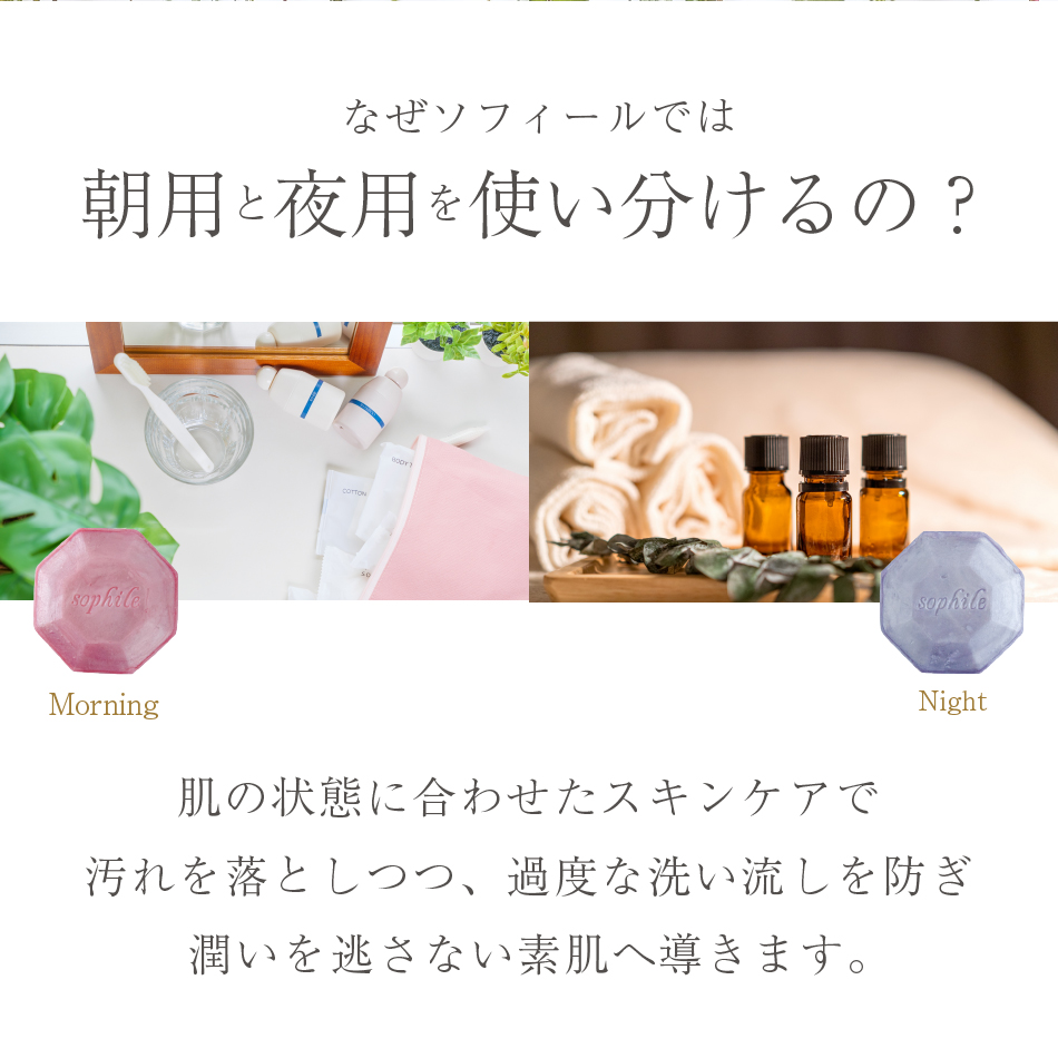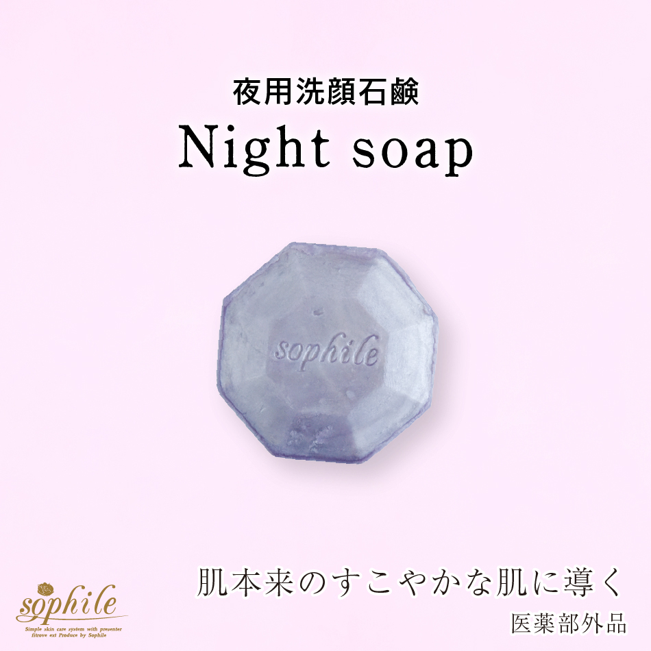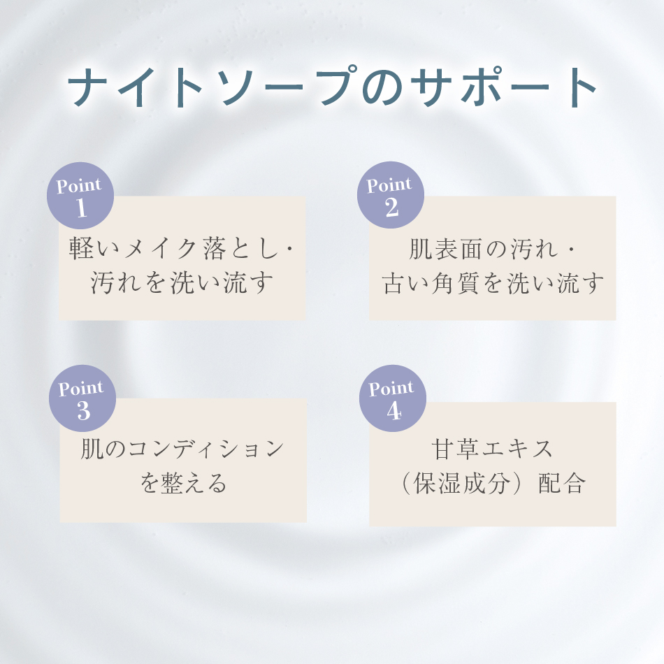 ナイトソープは、メイクやファンデーション、毛穴に詰まった皮脂や汚れなどをすっきりと洗い上げます。