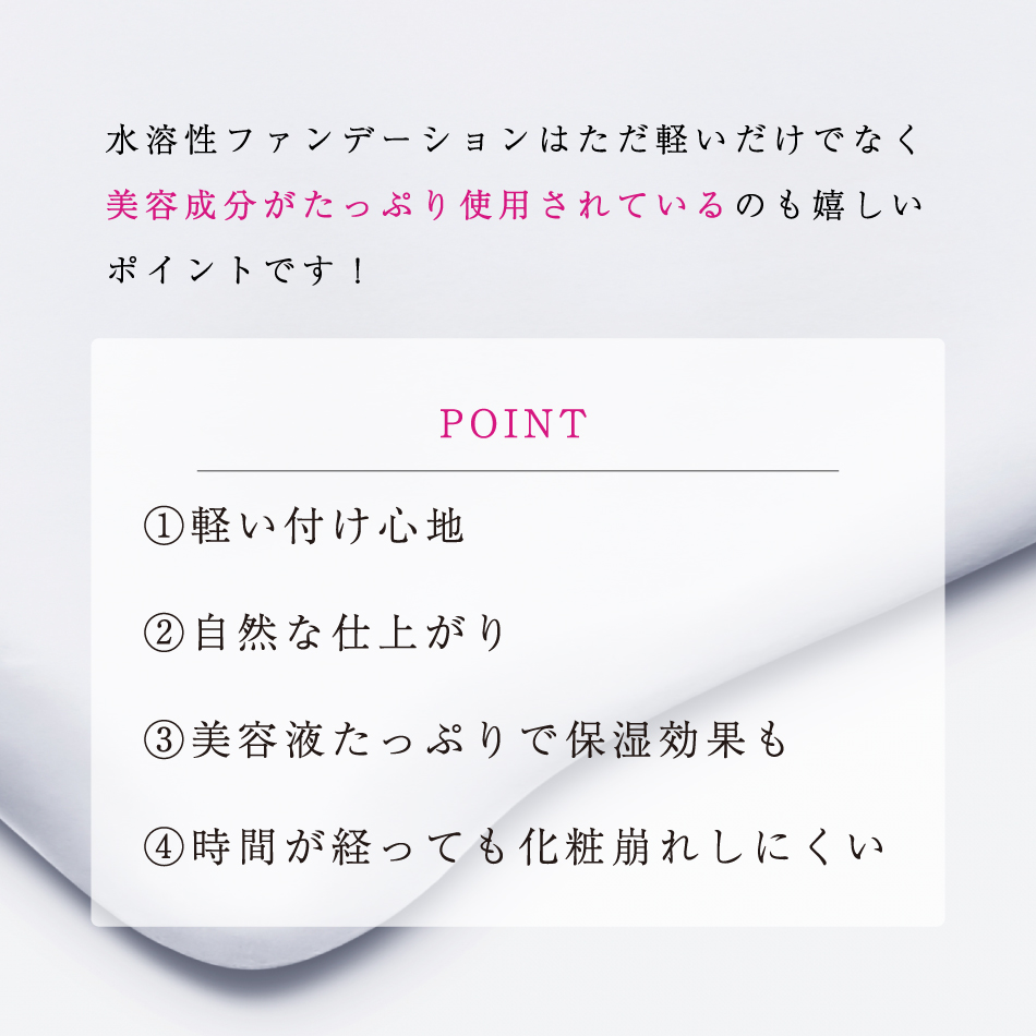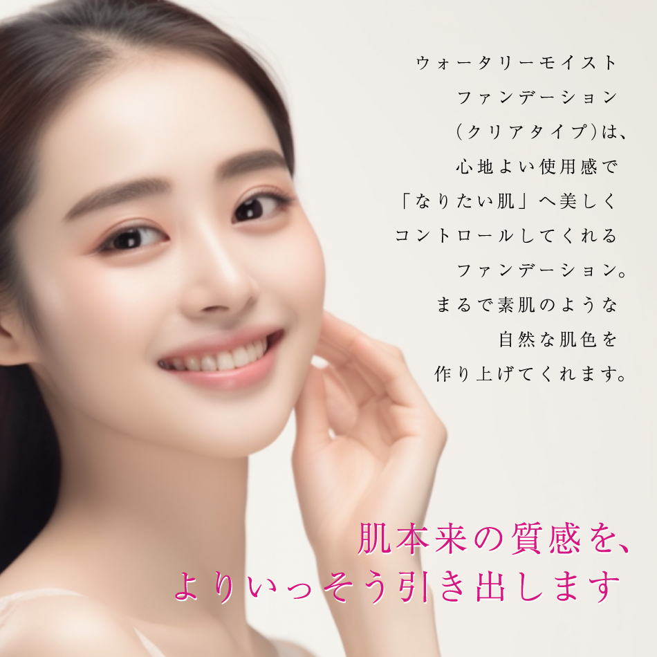 ウォータリーモイストファンデーション(クリアタイプ)は、水溶性のファンデーションだから、なんといっても肌が楽!付けているのも忘れるくらいの軽い使用感ながら、すぅーっとムラなく伸び、しっかり肌になじみます。厚塗り感はゼロ!まるで素肌のような自然な肌色を作り上げてくれます。