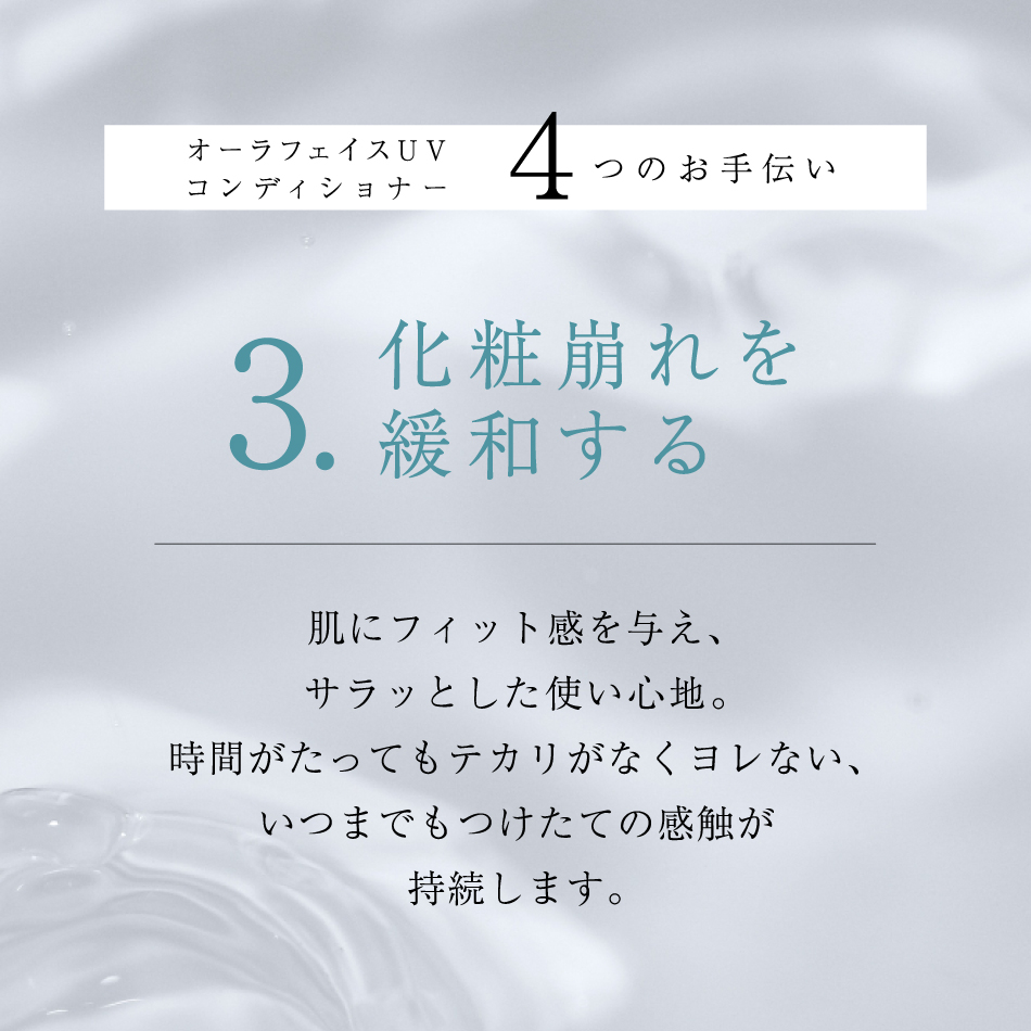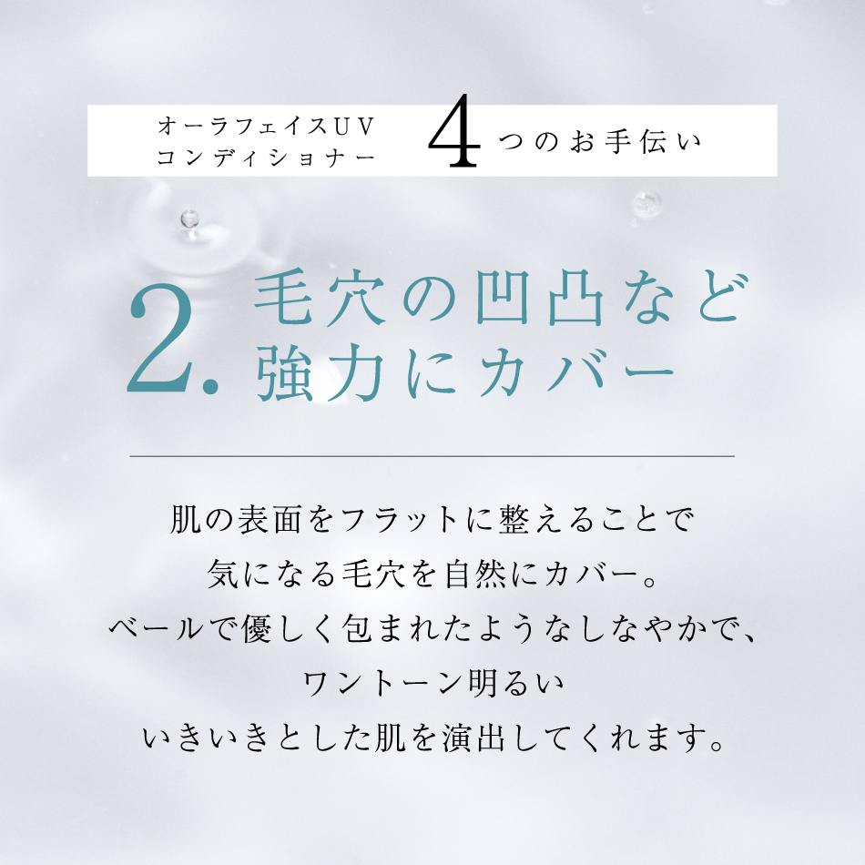 お肌をケアしながら、肌表面をフラットに整え、気になる毛穴を自然にカバー。ワントーン明るい、いきいきとしたお肌を演出します。